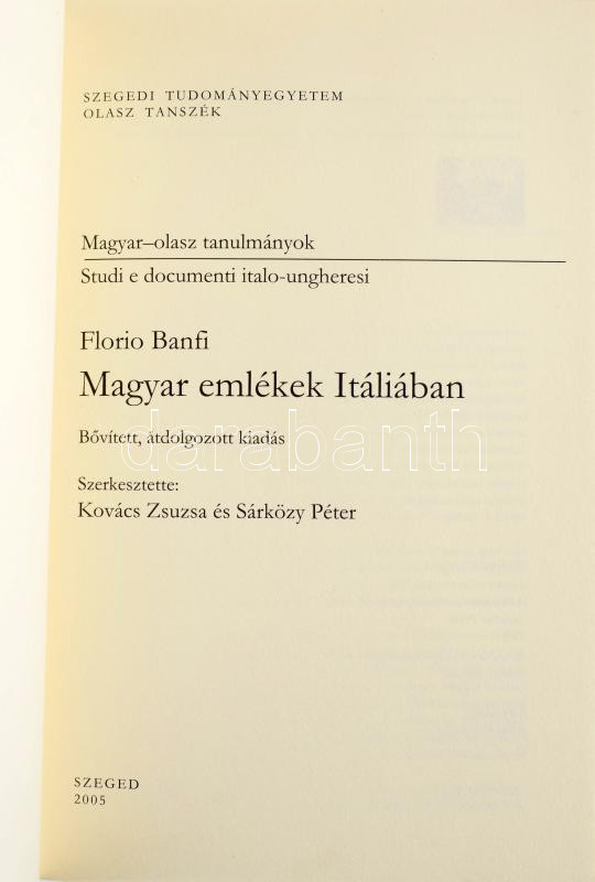 Florio Banfi: Magyar emlékek Itáliában. Szerk.: Kovács Zsuzsa, és Sárközy Péter. Magyar-olasz Tanulmányok. Studi e documenti italo-ungheresi. Szeged, 2005, Szegedi Tudományegyetem Olasz Tanszék, 380+1 p. Kiadói papírkötés.