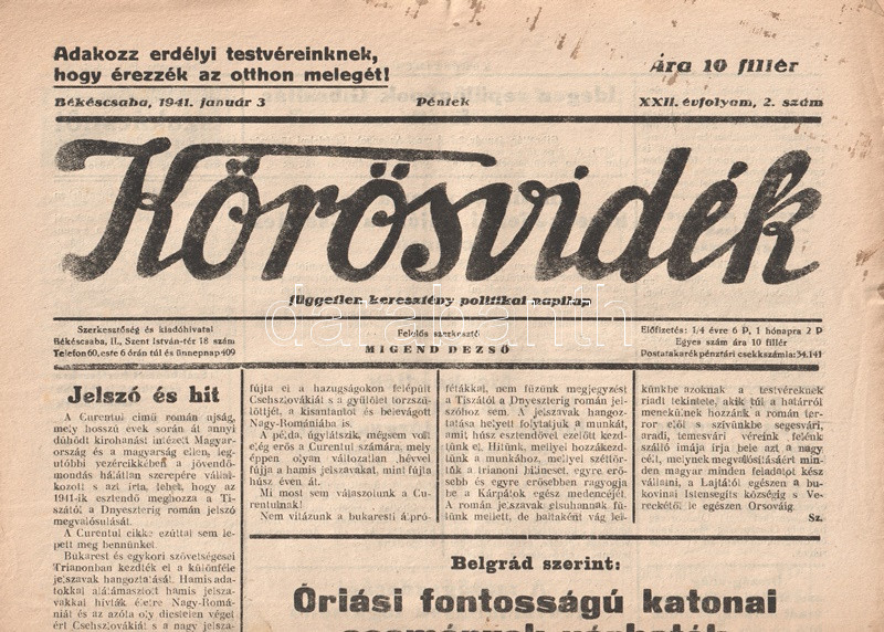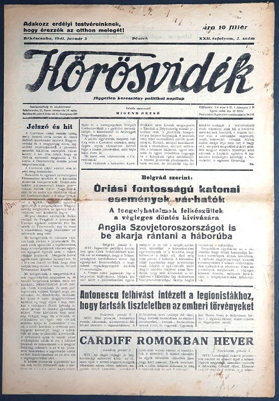 [Folyóirat] Körösvidék. Független keresztény politikai napilap. Felelős szerkesztő: Migend Dezső. XXII. évfolyam, 2. szám. (1941. január 3.)