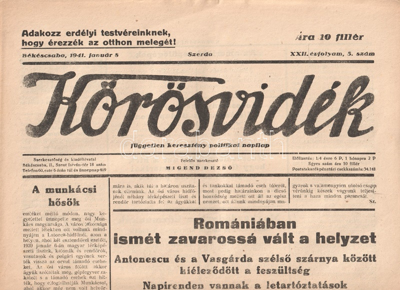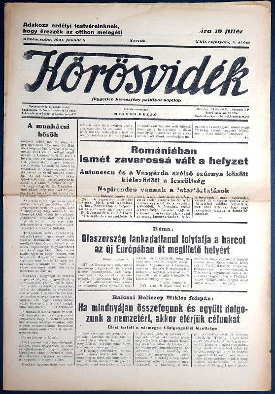 [Folyóirat] Körösvidék. Független keresztény politikai napilap. Felelős szerkesztő: Migend Dezső. XXII. évfolyam, 5. szám. (1941. január 8.)