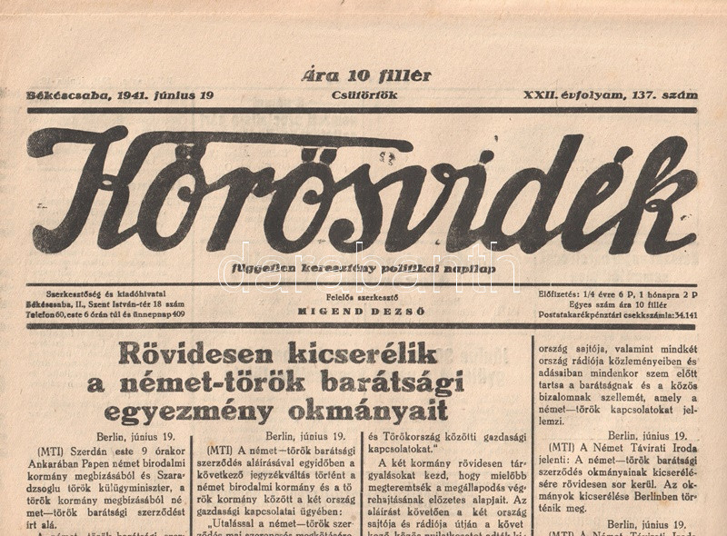 [Folyóirat] Körösvidék. Független keresztény politikai napilap. Felelős szerkesztő: Migend Dezső. XXII. évfolyam, 137. szám. (1941. június 19.)