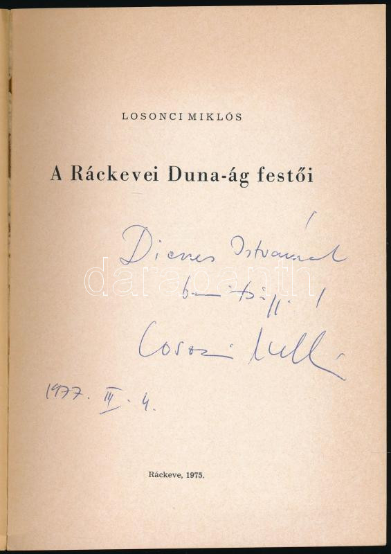 Losonci Miklós: A Ráckevei Duna-ág festői. A szerző, Losonci Miklós (1929-2010) művészettörténész által Dienes István (1929-1995) régész, muzeológus részére DEDIKÁLT példány! Ráckevei Járási Füzetek 6. Ráckeve, 1975., Pest m. Tanács V. B. RÁckevei Járási Hivatal Művelődési Osztálya, 79 p. Fekete-fehér képekkel illusztrált. Megjelent 3000 példányban. Kiadói papírkötés, a hátsó borító foltos.