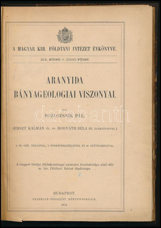 Rozlozsnik Pál: Aranyida bányageológiai viszonyai. Emszt Kálmán és Horváth Béla elemzéseivel. A Magyar Kir. Földtani Intézet Évkönyve XIX. köt. 6. füzet. Bp., 1912, Franklin-ny., (7) p.+ 236-354 p.+ (6) p.+ 8 t. Átkötött félvászon-kötésben, néhány lap széle sérült, helyenként kissé foltos lapokkal.