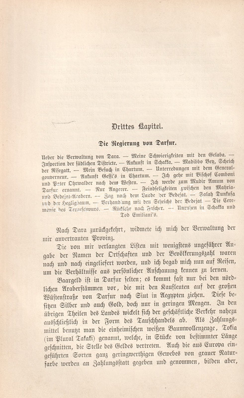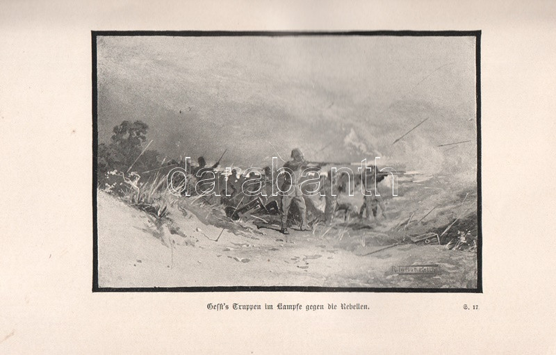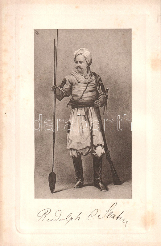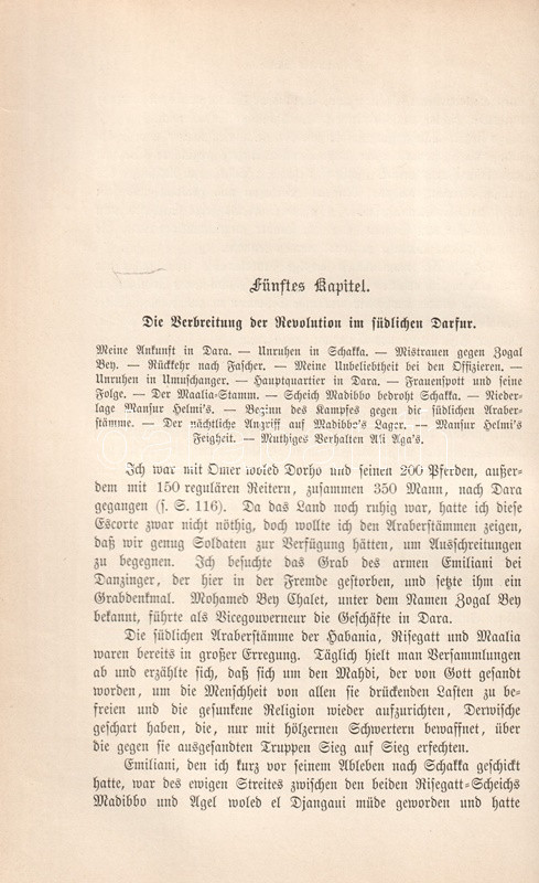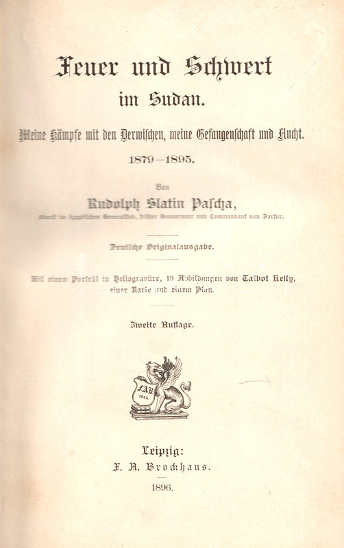 Rudolf Karl von Slatin (1857-1932) osztrák kalandor, katonatiszt, darfúri pasa beszámolója dél-szudáni kalandjairól. A török birodalomtól gyakorlatilag elszakadtan működő Egyiptom a Szuezi-csatorna építése során előbb államcsőd közeli helyzetbe, majd nyugati tőkeinjekciók révén egyre inkább angol befolyás alá került. Egyenlítőhöz közeli, szudáni területeire az 1870-es évektől egyre gyakrabban állítottak európai származású kormányzókat. Ezek egyike volt a Szudánban már korábban is megforduló osztrák katonatiszt és kalandor, Rudolf Slatin, avagy helyi elnevezése szerint Slatin pasa. 1879-es kinevezésétől kezdve a törzsi lázongások berekesztésével, illetve a polgárháborús körülmények között felújuló kelet-afrikai rabszolgakereskedelem felszámolásával bízták meg, ám rövidesen katonai konfliktusba került a helyi vallási vezetőkkel, mely küzdelemben (a kötetben hosszan ecsetelt katonai hőstettei ellenére) foglyul ejtették. Évtizedes fogságából végül kalandosan szökött meg. Kalandos részletekben, közép-afrikai néprajzi és törzsi részletekben, valamint politikai fordulatokban gazdag beszámolója 1896-ban egyszerre jelent meg angolul és németül. Példányunk az első kiadás második lenyomatából származik. Az osztrák kalandor beszámolója valóságos könyvszenzációnak számított a korban, számos nyelvre lefordították. Magyar nyelvű változata szintén 1896-ban jelent meg, "Tűzzel-vassal a Szudánban: küzdelmeim a dervisekkel, fogságom és szökésem" címmel.