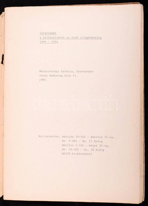 Leírás: Szentendre a milleniumtól az első világháborúig 1896-1914 (Helytörténeti kiállítás) 1987. 71p. Papírborítóval. Csak 300 pld.