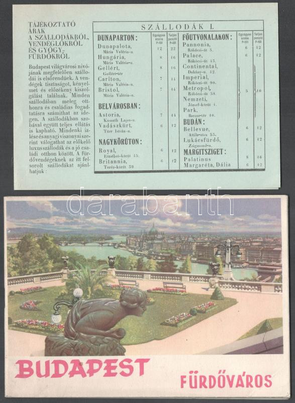 cca 1930 Budapest fürdőváros. Bp., Budapesti Központi Gyógy és Üdülőhelyi Bizottság, 16 sztl. lev. Fekete-fehér fotókkal illusztrált. Benne "Tájékoztató árak a szállodákról, vendéglőkről és gyógyfürdőkről" tájékoztatóval, Bp., Globus-ny., 2 sztl. lev. Kiadói haránt-alakú papírkötés.