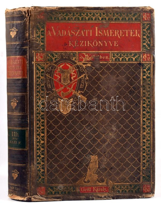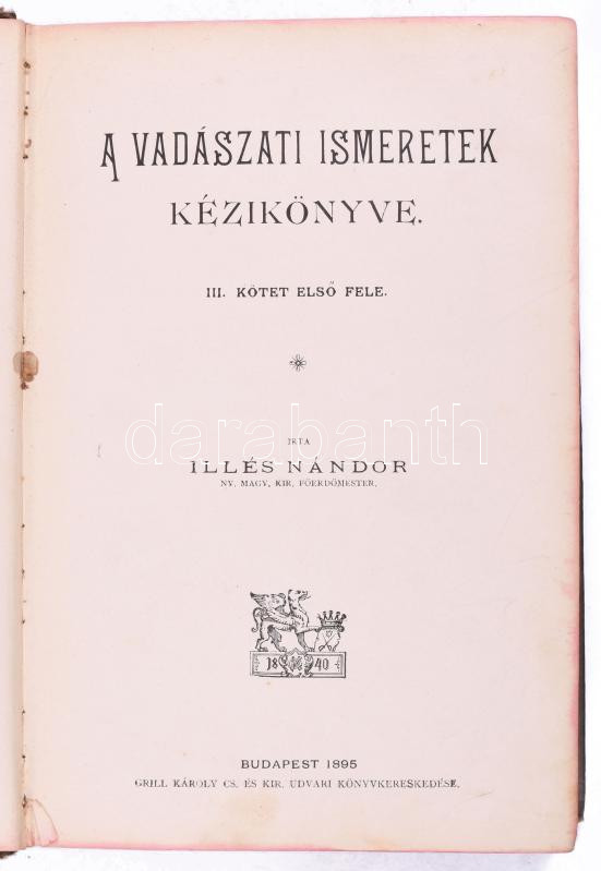 Leírás: A vadászati ismeretek kézikönyve. III. köt. Illés Nándor: (A vadászat kezelése és gyakorlása.) 1. rész. Bp. 1895. Grill. VIII, 448 l.; Gazdag szövegközti és egészoldalas képanyaggal. Festett, aranyozott, kiadói egészvászon-kötésben, sarkain sérülésekkel