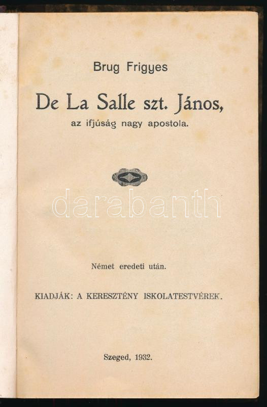 Brug Frigyes: De La Salle szt. János, az ifjúság nagy apostola. Szeged, 1932, Keresztény Iskolatestvérek, 255+(1) p.+ 7 (fekete-fehér képek) t. Kiadói aranyozott félvászon-kötés, helyenként kissé foltos lapokkal.