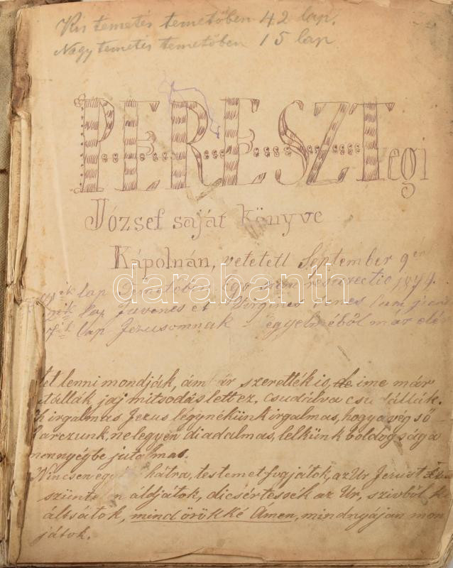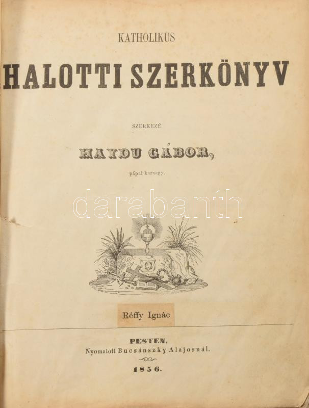 Haydu Gábor: Katholikus halotti szerkönyv. 1856. Bucsánszky 1. kiadás. 86p. Sok korabeli kézzel írt jegyzettel és plusz betoldott lapokkal. Korabeli, félvászon-kötésben halálfejjel a borítón