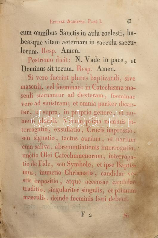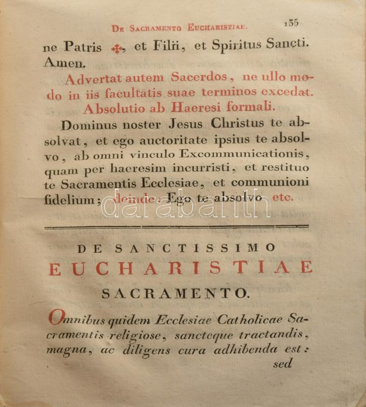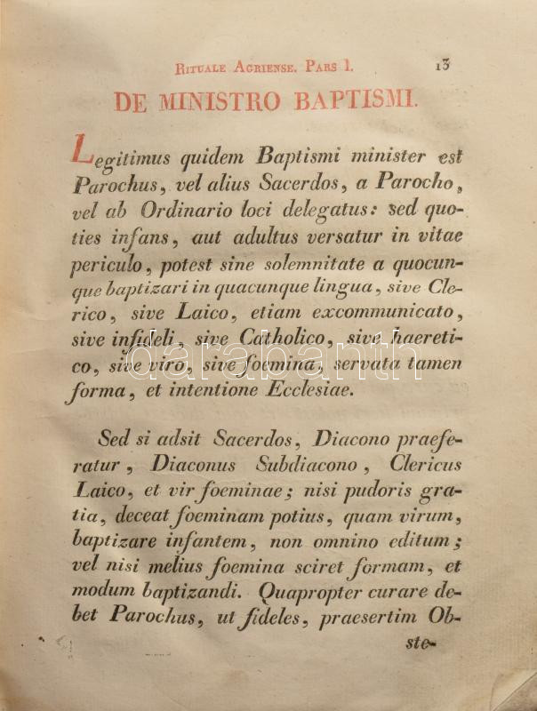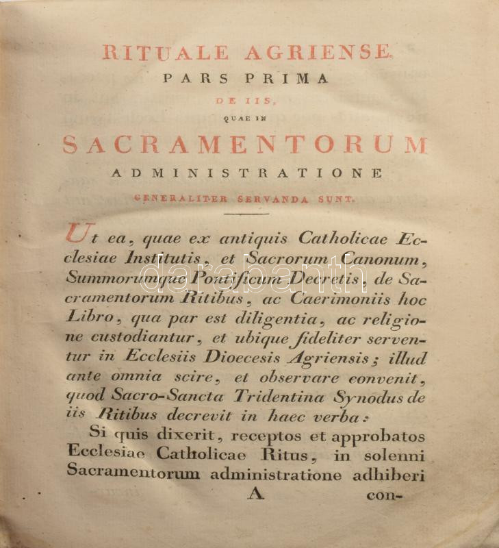 Rituale Agriense, seu formula agendorum in administratione sacramentorum et caeteris ecclesiae publicis functionibus, jussu ... Stephani ... Fischer ... ecclesiae Agriensis archi-episcopi ... Novis ed., emend. et auct. Budae, 1815. Typ. Univ. Pest. XII, 595 l. Korabeli, sérült egészbőr-kötésben
