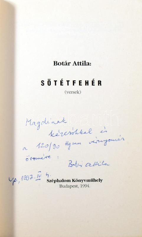 Leírás: Botár Attila: Sötétfehér. (Versek.) DEDIKÁLT! Bp., 1994, Széphalom Könyvműhely, 80 p. Kiadói papírkötés.