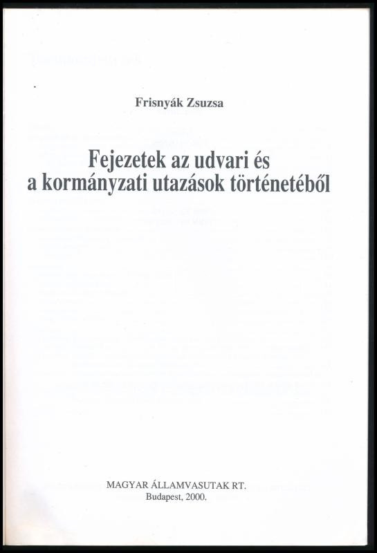 Leírás: Frisnyák Zsuzsa: Fejezetek az udvari és kormányzati utazások történetéből. Vasúthistória könyvek. Bp., 2000, MÁV. Fekete-fehér fotókkal illusztrálva. Kiadói papírkötés, helyenként kisebb lapszéli ázásnyomokkal.