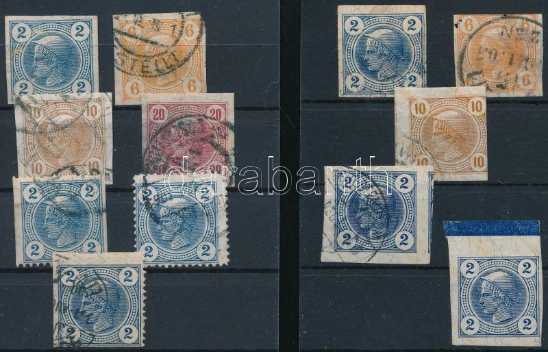 Leírás: 1899 7 db Hírlapbélyeg, benne 3 db magánfogazással + 1901 5 db Hírlapbélyeg lakksávval, benne ívszéli is