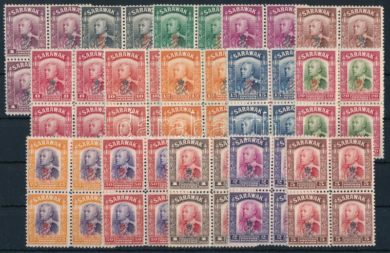 Sarawak 1947 Brit koronagyarmat Mi 150-164 négyes tömbök (minden bélyeg postatiszta, de egyes darabokon a berakó celofánja által okozott fényes foltok láthatók)