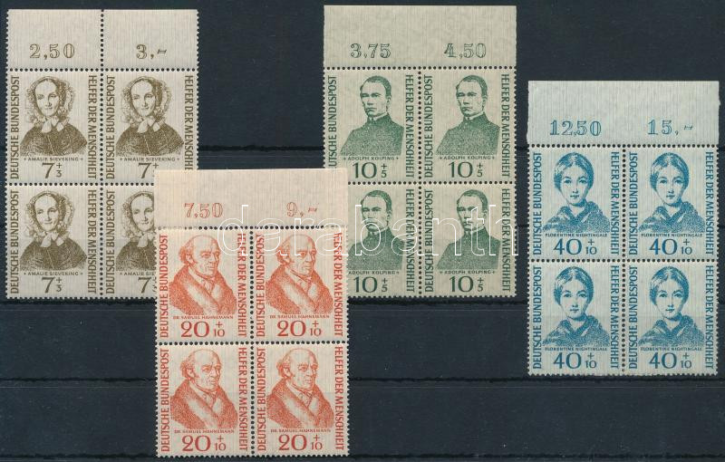 1955 Jótékonyság sor ívszéli négyestömbökben Mi 222-225 (Mi 225 2 bély... https://www.darabanth.com/hu/510-Gyorsarveres/510.0/Kulfoldi-filatelia-es-postatortenet/NSZK~1019/1955-Jotekonysag-sor-ivszeli-negyestombokben-Mi-222-225-Mi-225-2-belyegen-betapadas-gum~II3431913