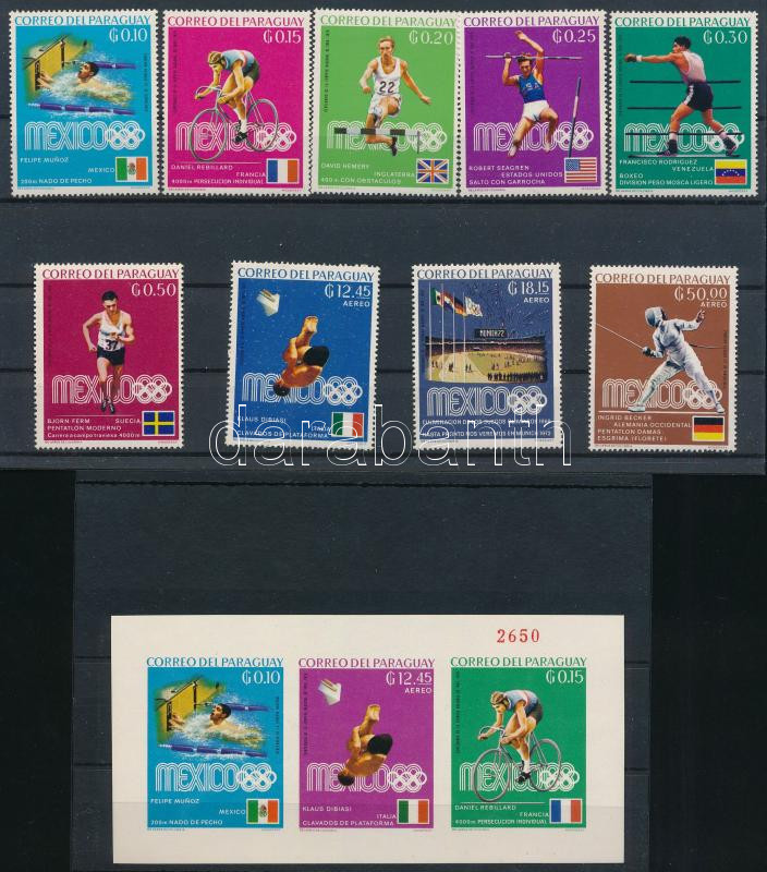 1969 A nyári Olimpia aranyérmesei, Mexikó 1968 sor + vágott blokk Mi 1... https://www.darabanth.com/hu/510-Gyorsarveres/510.0/Kulfoldi-filatelia-es-postatortenet/Paraguay~1030/1969-A-nyari-Olimpia-aranyermesei-Mexiko-1968-sor-plus-vagott-blokk-Mi-1883-1891-plus-Mi-118~II3412613