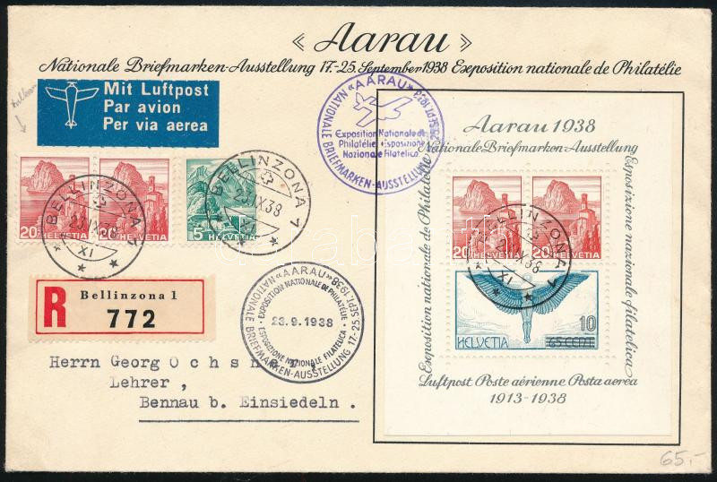Leírás: 1938 Aarau bélyegkiállítás blokk ajánlott légi levélen