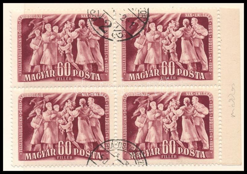 Leírás: 1950 Felszabadulás (II.) 60f négyestömb minden bélyegre kiterjedő teljes makkos vízjellel