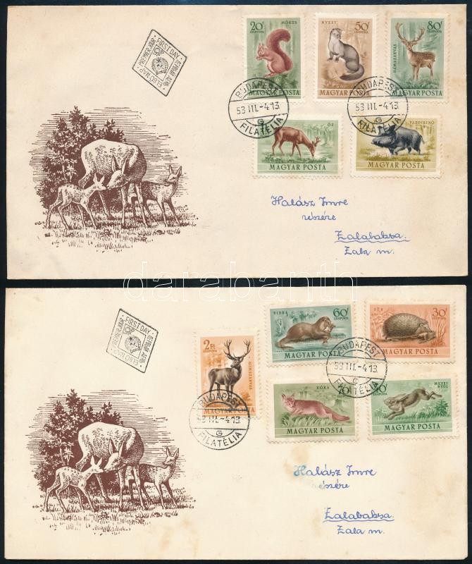 1953 Erdei állatok sor 2 db futott FDC-n https://www.darabanth.com/hu/510-Gyorsarveres/510.0/Magyar-filatelia-es-postatortenet/1946-1956-kozotti-kiadasok~52/1953-Erdei-allatok-sor-2-db-futott-FDC-n~II3447753