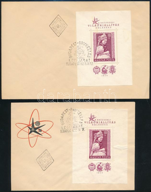 Leírás: 1958 Brüsszeli Világkiállítás blokk 2 db FDC-n Budapest-Bruxelles légijárat bélyegzéssel