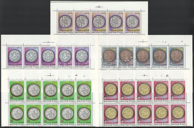 Leírás: 1979 Középkori magyar pénzek sor tízestömbökben, ívszéli jelzésekkel