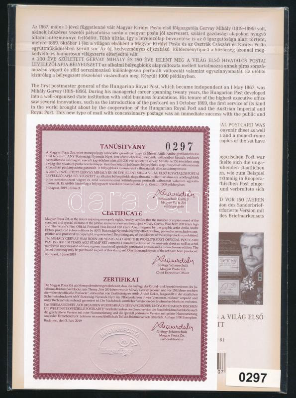 2019 200 éve született Gervay Mihály bélyegszett bontatlan csomagolásban benne a blokk fogazott, zöld sorszámú különleges fogazású, piros sorszámú vágott és egyszínnyomatú sötétbarna változata