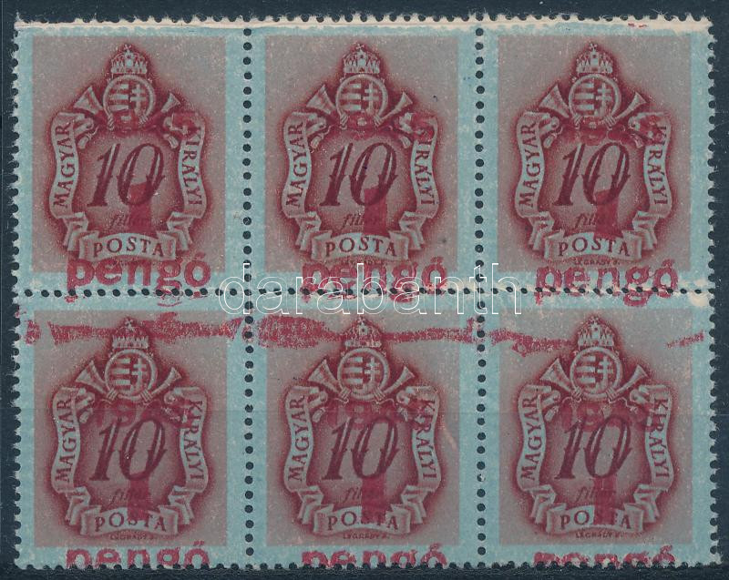 Leírás: 1945 Kisegítő portó 1P/10f hatostömb elcsúszott felülnyomással és festékcsíkokkal / Mi P 174 block of 6 with shifted overprint and paint stripes