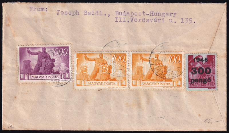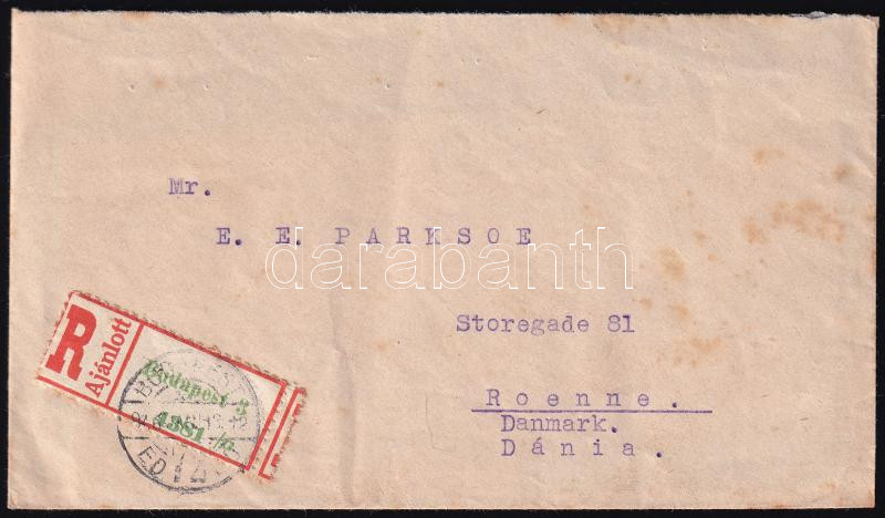 1946 (5. díjszabás) Ajánlott levél Dániába 4 bélyeggel, de mivel nem volt postaforgalom Dániával, ezért a levél Budapesten maradt / Registered cover to Denmark, but there was no postal traffic with Denmark
