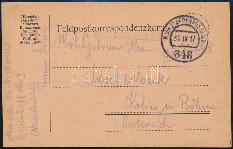 1917 Tábori posta levelezőlap "K.u.K. ETAPPENPOSTAMT 348" , ... https://www.darabanth.com/hu/510-Gyorsarveres/510.0/Magyar-filatelia-es-postatortenet/I-Vilaghaborus-osztrak-magyar-tabori-posta-Haditengereszet~41/1917-Tabori-posta-levelezolap-KuK-ETAPPENPOSTAMT-348-K-u-K-SPITALSCHIFF-No-V~II3444883