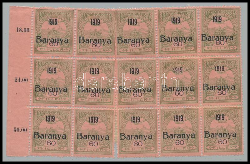 Baranya I. 1919 Turul 60f ívszéli 15-ös tömbben, benne kis szám, rövid egyes, zászlós egyes és egyéb lemezhiba, Bodor vizsgálójellel (11.600) (fogelválások / aparted perfs.)