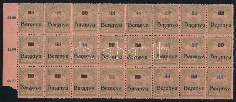 Baranya I. 1919 Turul 60f ívszéli 24-es tömbben, benne kis szám, rövid egyes, zászlós egyes és egyéb lemezhiba, Bodor vizsgálójellel (11.200) (fogelválások / aparted perfs.)