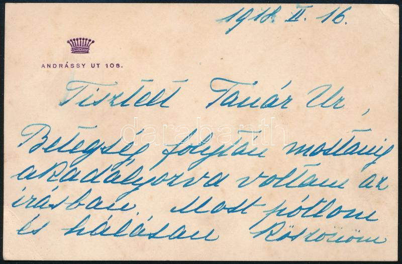 Leírás: 1918 Gróf Bethlen Irma (1844-1932) írt üdvözlő sorok