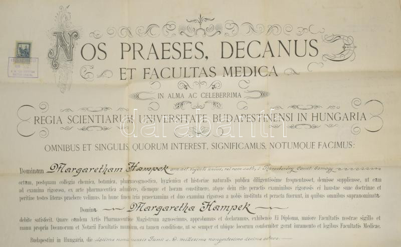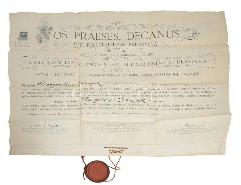 Leírás: 1918 Gyógyszerész diploma, Goldziher Ignác (1850-1921) magyar orientalista, egyetemi tanár, a budapesti izraelita hitközség titkárának aláírásával