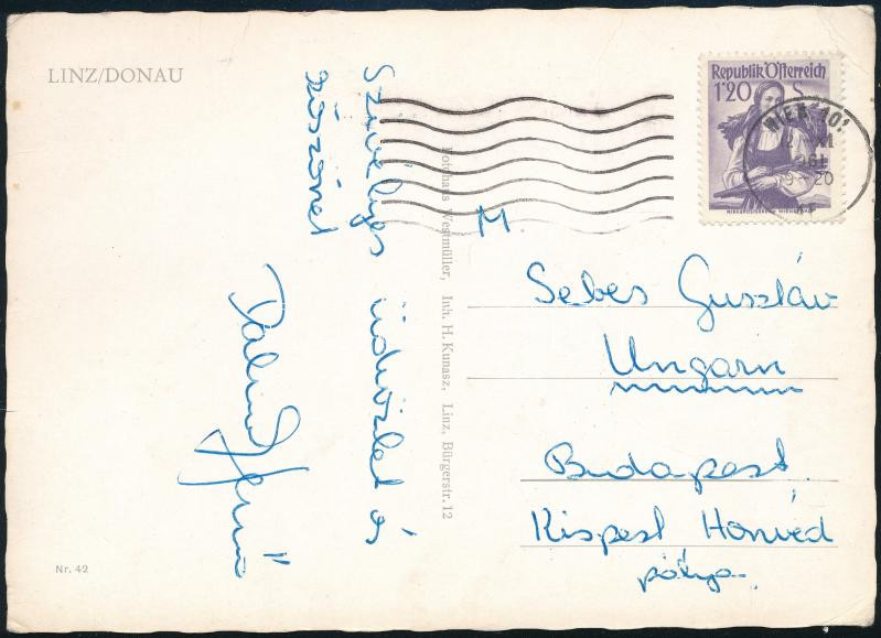 Dalnoki Jenő Ausztriából küldött képeslapja Sebes Gusztávnak 1961 novemberében.