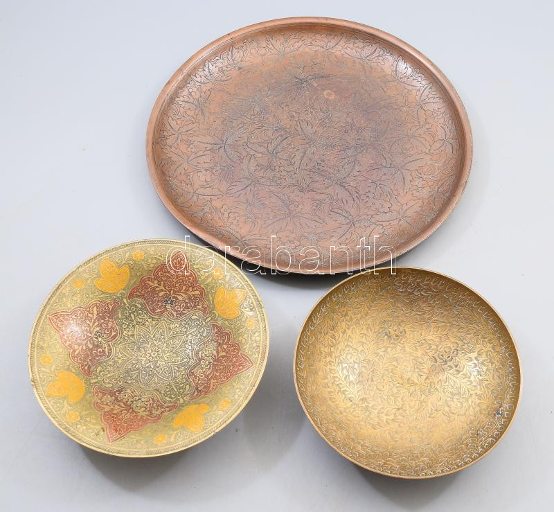 Leírás: 3 darab réz és bronz kínáló, horpadással, d: 28 cm alatt