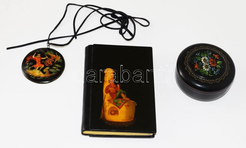 Leírás: 3 db orosz, festett fa fedeles notesz, nyaklánc és balzsamtartó