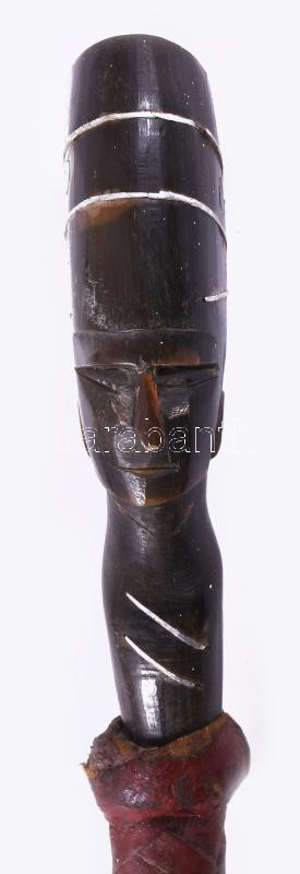 Leírás: Bőr lovaglópálca, faragott egyiptomi fej alakos szaru markolattal, h: 52 cm