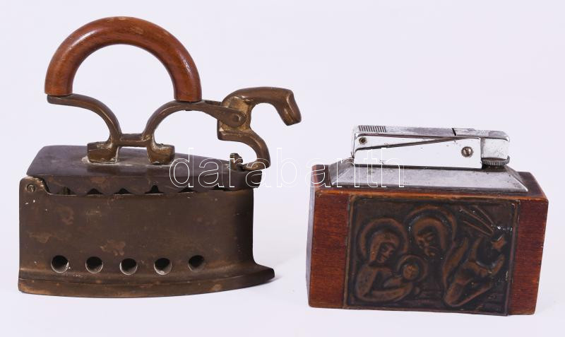 Leírás: Kisméretű bronz vasaló + vallásos jelenettel díszített öngyújtó, h: 8,5-10 cm