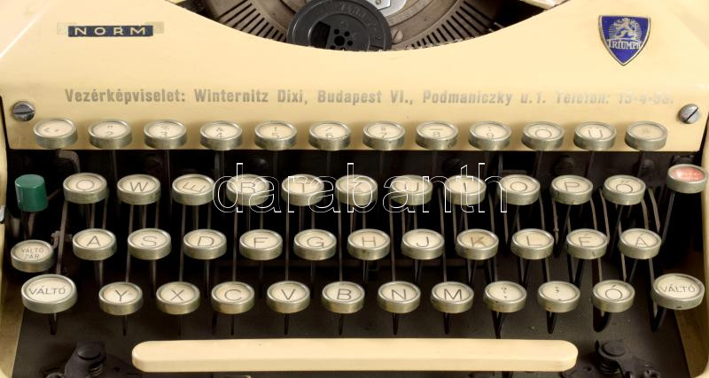 cca 1938 Triumph Norm 6 írógép, rajta "Vezérképviselet: Winternit... https://www.darabanth.com/hu/510-Gyorsarveres/510.0/Mutargy-papirregiseg-egyeb/Bolhapiac~795/cca-1938-Triumph-Norm-6-irogep-rajta-Vezerkepviselet-Winternitz-Dixi-Budapest-feliratta~II3451825