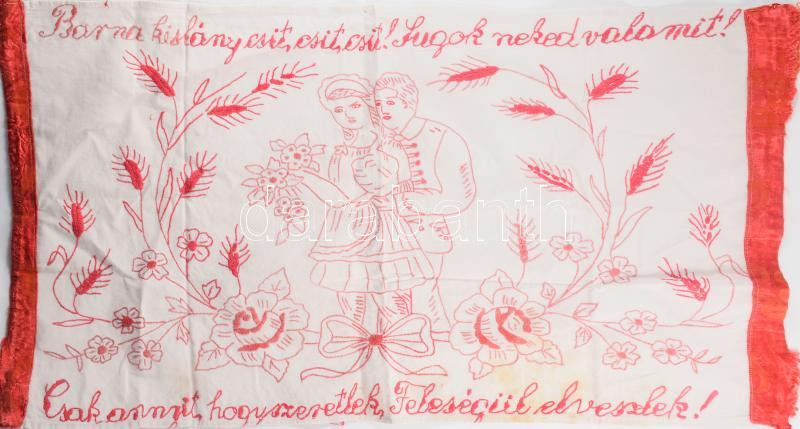 Leírás: Hímzett fali terítő, "Barna kislány csit csit csit, Sugok neked valamit, Csak annyit hogy szeretlek, Feleségül elveszlek" felirattal, 43x70 cm