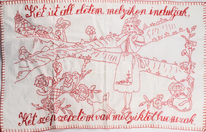 Leírás: Kézzel hímzett gyermek falvédő, "Két út áll előttem, melyiken induljak, két szép szeretőm van, melyiktől búcsúzzak" felirattal, 40x72 cm