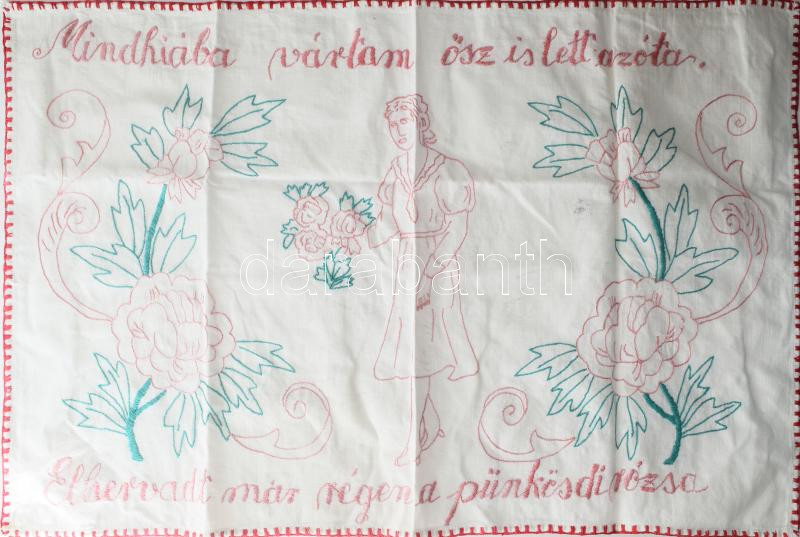 Leírás: Kézzel hímzett konyhai falvédő, "Mindhiába vártam, ősz is lett azóta, Elhervadt már régen a pünkösdi rózsa" felirattal, 42x68 cm