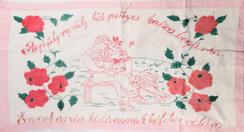 Leírás: Kézzel hímzett konyhai falvédő, "Repülj repülj hétpettyes katica-bogárka, Ennek a szép kislánynak hófehér vállára" felirattal, 45x75 cm