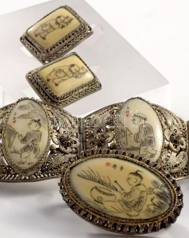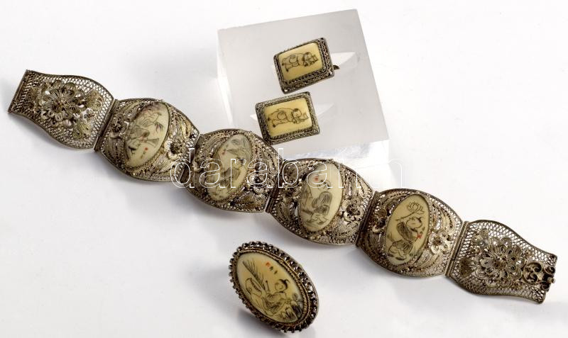 Leírás: Kínai filigrán ezüstözött réz ékszer szett, karkötő, fülbevaló pár, bross.