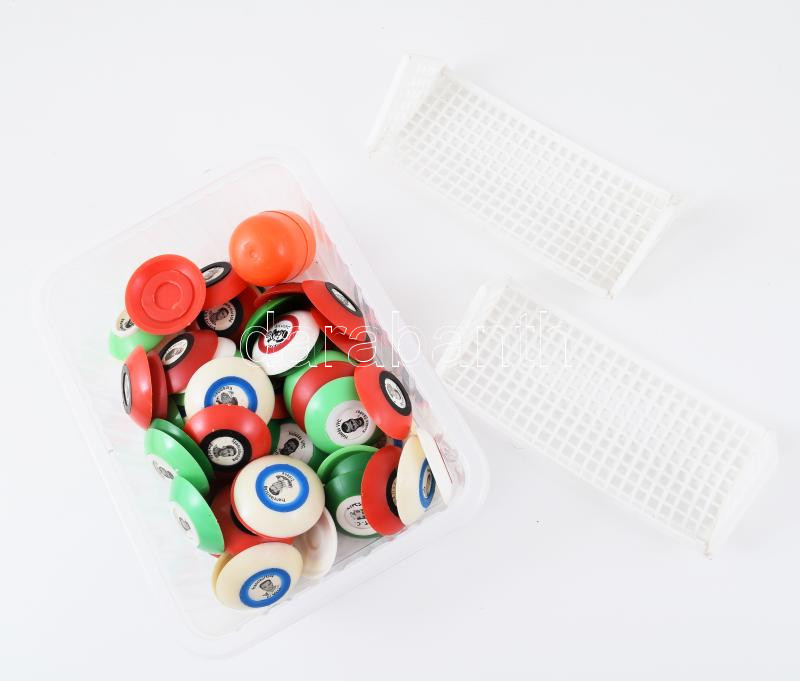Leírás: Kis doboznyi gombfoci, 2 kapuval.