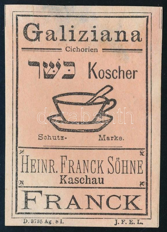 Galiziana kóser kávéitalcímke H. Franck kassai (Felvidék) cégtől https://www.darabanth.com/hu/510-Gyorsarveres/510.0/Mutargy-papirregiseg-egyeb/Judaika~810/Galiziana-koser-kaveitalcimke-H-Franck-kassai-Felvidek-cegtol~II3453559