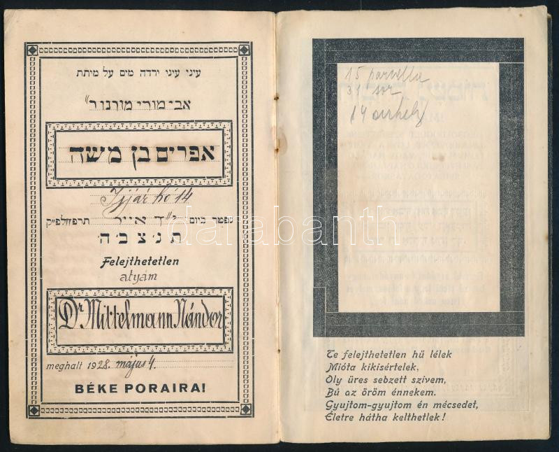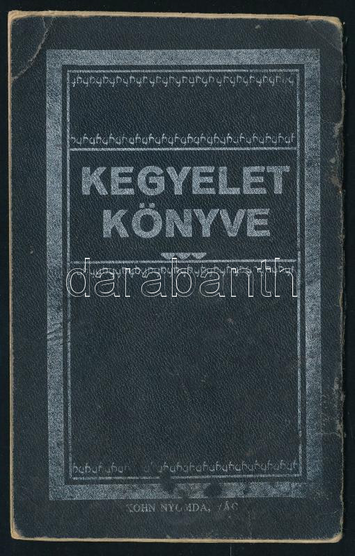 Kegyelet könyve. Imádság megboldogult szeretteink lelkiüdvéért úgy a templomi mazkir, vagy halálozási évforduló napján, mint sírlátogatáskor. Kiadja: Rosner Ármin, a Pesti Izraelita Hitközség nyug. tanácsosa. Vác, 1927, Kohn-ny., 16 p. Benne 1928-tól 1953-ig kitöltött naptárral. Kiadói kartonált papírkötés, sérült borítóval.