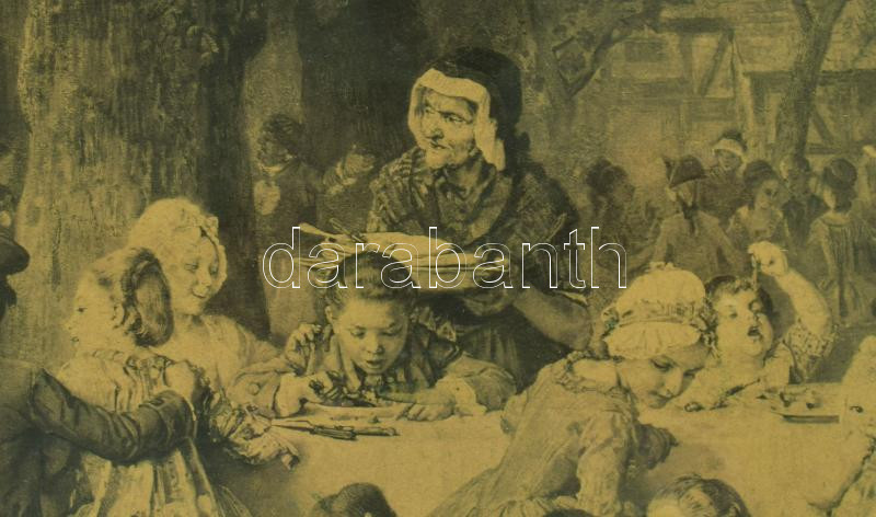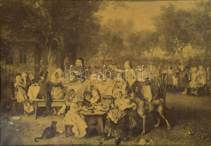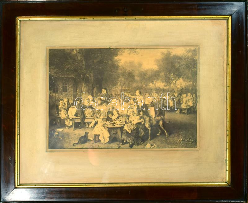 Leírás: Régi fénnyomatú életkép, festmény másolat, Dekoratív, üvegezett fakeretben. 31×44,5 cm. A keret küldő mérete 60x75 cm Hátoldalán fatáblával lezárt