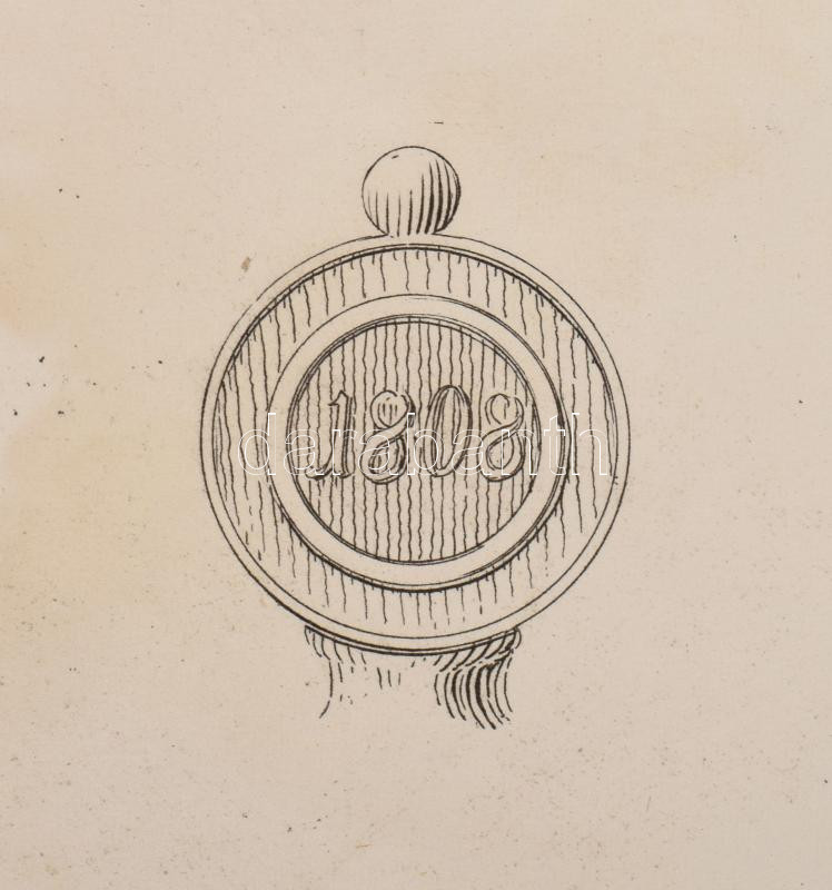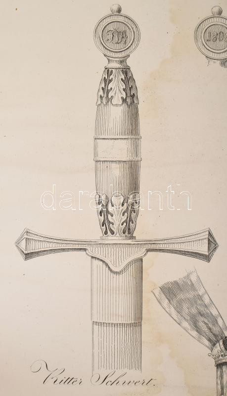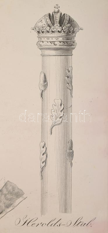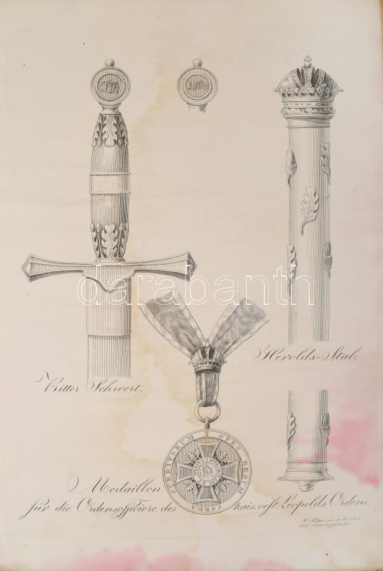 1808 [A Lipót tisztjeinek kellékeit ábrázoló nagy méretű rézmetszet] Ritter-Schwert- Herold-Stab- Medaillon für die Ordensoffiziere des kais. oest. Leopolds Ordens. Wien, 1808. T. Fischer. Nagy méretű rézmetszet, selyem előzéklappal. 27,5x39,5 cm Foltos / Copper plate engraving stained