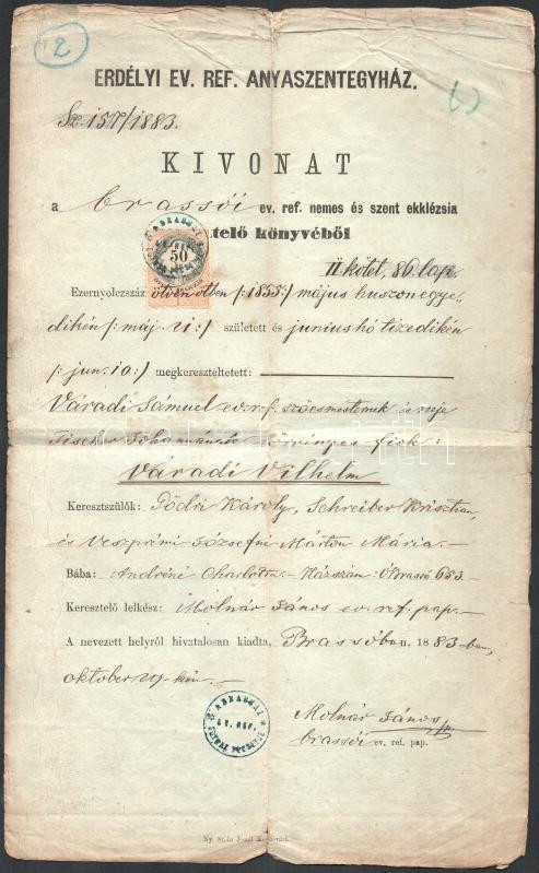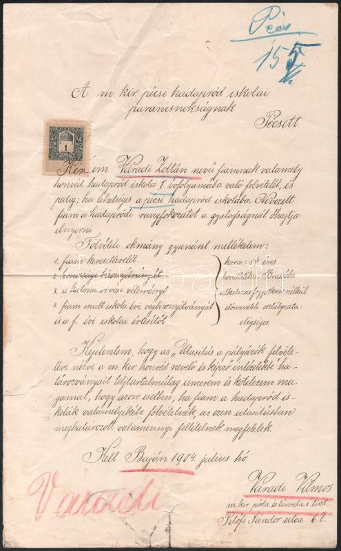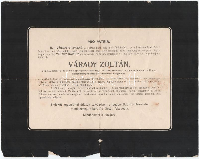 1915 Várady Zoltán hősi halált halt m. kir. brassói 24-ik honvéd gyalogezredbeli főhadnagy gyászjelentése, szakadt + hadapródiskolai papír és édesapja brassói anyakönyve