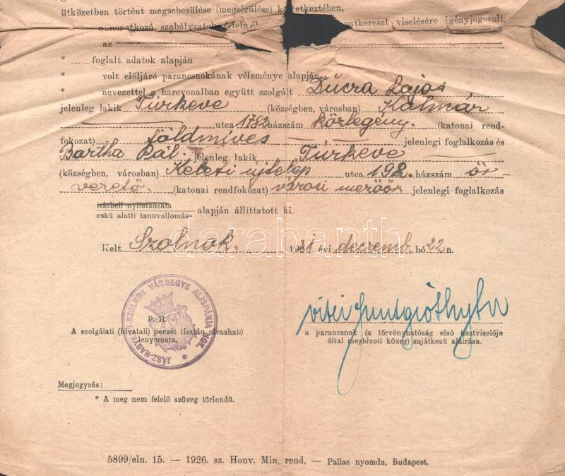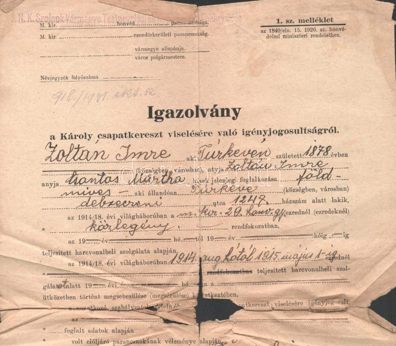 Leírás: 1931 Igazolvány a Károly csapatkereszt viselési jogosultságáról